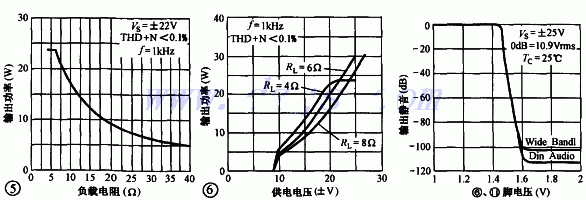 电气参数如表2所示, LM1876的负载范围很宽,在4~30Ω的范围内均能稳定地工作,其输出功率与负载的对应关系如图5所示。LM1876的