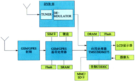 移动数字电视手机包含两个分系统:DVB-H移动数字电视分系统和GSM/GPRS通信分系统,如图1所示。两个分系统以应用处理器为主机,控制DVB-H移动数字电视接收器和GSM/GPRS通信模块。