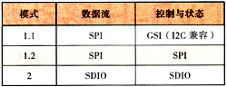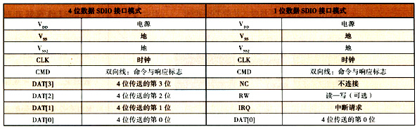 SDIO接口模式时,控制和状态报告及数据流都是通过SDIO来交换的,分为4位和1位数据接口模式,如表2所列。