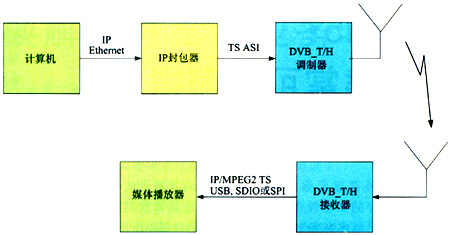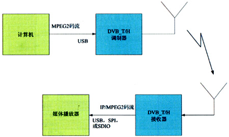 在DVB-H/T工作验证的简单装置中,所有数据录好存在计算机中,并传送到提供射频信号的调制器中,这个装置可以与发送内容毫无关系地来评估DVB-H/T接收器。装置如图5所示。