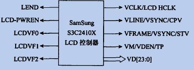 S3C2410 LCD控制器用于传输视频数据和产生必要的控制信号,像VFRAME、VLINE、VCLK、VM等等。除了控制信号,S3C2410还有输出视频数据的端口VD[23 z O],如图1示。将要用到的管脚描述如下:VCLK—— 像素时钟信号;VD[23:O]——LCD像素输出端口;VM/VDEN/TP— —LCD驱动器的AC偏置信号(STN)/数据使能信号(TFT)/SEC TFT源驱动器数据加载脉冲信号。