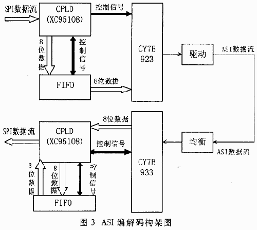 cyb923主要实现码字的8/10bit转换、插入同步字K28.5和并/串变换。ASI的传输速率恒定为270MHz,而输入MPEG-2 TS码率是不同的,所以要用FIFO实现速率匹配,需要对输入的SPI数据、FIFO和cyb923之间的通信进行逻辑控制。综合性能、价格和程序复杂度的考虑,本方案采用xilinx公司的CPLD逻辑编程器XC95108;用VHDL编程实现对它们的逻辑控制。ASI的解码也是相似的过程,cyb933主要实现10/8bit转换、去除同步字K28.5和串并变换。