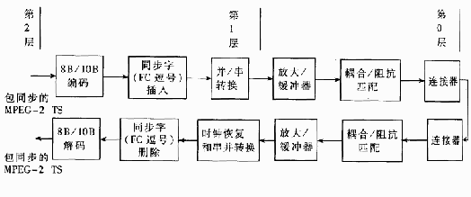 ASI传输流可以有不同数据速率,但传输速率恒定,为270Mbps,因此ASI可以发送和接收不同速率的MPEG-2数据。ASI传输系统为分层结构。最高层、第2层使用MPEG-2标准ISO/IEC 13818-(Systems),第0层和第1层是基于ISO/IEO CD 14165-1的FC纤维信道。FC支持多种物理传输媒介,本方案选用同轴电缆传输,图2是基于同轴电缆的ASI传输系统框图。