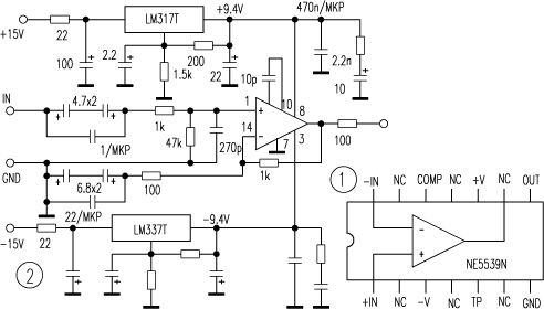 NE5539N的管脚排列较为罕见,见图1,所以如此,是由其高性能所决定。因此,在设计印板图时,必须遵循高频电路的设计原则施行。设计原则为:1?大面积包围接地(特别注意该IC的7脚为接地端),为此使用双面敷铜板,元件面为“地”覆盖。业余制作情况下,在适当位置通过钻孔、穿线,同印刷面“地”相焊。2?负反馈电阻应靠近负输入端。3?使用低内阻电源供电。为简化制作,使用LM317、LM337构成。应指出,该IC的供应电压不应超出±12V,这里使用±9~10V。另外,稳压后的滤波电容容量不应大,这里取22μF。4?为发挥其动态范围,在靠近IC电源脚处加 取值适当的RC串联回路,见图2。5?为保证低噪声,负输入端对地电阻取值应足够小,这里取100Ω。6?经试验,5与{11}脚的频率补偿端需并100pF左右电容。7?由于该IC的输入失调电压较大,为2?5mV,故不能取消隔直电容。