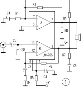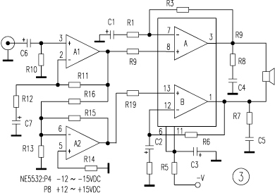 BTL功率放大器由两个放大器组成,负载的两端分别接在两个放大器的输出端。其中一个放大器的输出是另外一个放大器的镜像输出,即负载两端的信号仅在相位上相差180度。负载上将得到原来单端输出的2倍电压。从理论上来讲电路的输出功率将增加4倍。并不是所有的功放块都适用于BTL形式,BTL形式的几种接法也各有优劣。下面对各种接法逐一介绍。 图1是LM4766的第一种BTL接法。输入信号从LM4766放大器B的同相输入端输入,放大器A的反相输入端信号经过R9从放大器B的输出端引入。在负载上得到的输出为此二信号的叠加。但是R9必须严格等于R6,否则这一误差将会被A的放大系数所放大,使A和B的输出信号幅度相差很多。其二由于A的负反馈中C1的存在,A的输出在相位上并不会完全与B的输出相差180度。在实际聆听中也发现,电路的输出在定位与层次感上,的确让人糊涂。但此电路不论是空载还是无输入信号,抑或输入信号的信号源内阻很大,电路皆能正常工作。稳定简单是其优点。 图2是第二种BTL接法。A作为反相放大器,B作为同相放大器。A的增益为-R17/R1,B的增益为(R4+R6)/R4,可取适当的值使二者增益相等。由于A、B放大器的输入信号在相位上是绝对相等的,经过放大后相位即使有延迟,但只要延迟的相位相等,叠加后也不会存在相位混乱的问题。此电路对输入信号源的要求很高。信号源必须在电路上电前加入,而且内阻要足够小。在不接入信号源时,由于A处于开环状态,A基本上会自激。当信号源内阻太大时,A的放大系数会变小。此种接法适用于在电路中加有低输出电阻前级的电路系统中。图3是第三种BTL 法。电路中加有一块NE5532。在A1中使用了C7电容,因此在A1的输出中是不含直流分量的,所以A2可采用直流负反馈,这使得A2的输出与A1的输出正好相差180度,因而不存在图1接法的相位延迟问题。同时由于NE5532的输出内阻是相当小的,它又解决了图2接法中不稳定的问题。 作者对以上三种方法,分别用美国国家半导体的LM1875、LM3886、LM4766和菲利浦的TDA1514做了测试。 LM1875最高电压可达±30V,输出电流可达3A,最大输出功率30W。无过流和温度保护电路。应用于图1接法时,声音有点飘的感觉 。在图2与图3的应用中声音结实有力。在图2中当拔掉音频输入端子时,喇叭中有秃秃的声音,证实它在自激。三种电路输出功率均可达80W左右。 然后以图3方式,对LM3886和TDA1514做了一番比较。 TDA1514最大供应电压是±30V,当负载是8Ω时,推荐用±24V。LM3886的负载是8Ω时推荐用±35V,负载是4Ω时推荐用±28V。 TDA1514应用于BTL方式时容易自激。在每个放大器输出端必须用一个1/4W10Ω电阻与0?047μF电容串连到地。反馈电阻(一般是27kΩ到33kΩ)减小到20kΩ到22kΩ,以减小增益。TDA1514内部有限流保护和最大功率限制电路,在接成BTL电路,发现最大功率达100W左右时,限流电路开始动作。输出端在正弦波的峰顶时被关闭。过了峰顶后又打开,虽然不是很容易听出来,但已严重影响了音质。超过110W时功率限制电路工作,输出端被彻底关掉。 LM3886有独特的SPIKE保护电路,它并不是在输出超额时就简单的关掉电路。SPIKE保护有一个转换区间。LM3886也有固定的温度检测过流保护。最大输出电流比TDA1514稍大,实际最大输出功率60W。在接成BTL时,最大功率可达120W左右。二者音质难分伯仲,只是当LM3886应用于高电压时,其音质在结实方面要胜一筹。 最后对LM4766接成图3方式实验,电路输出功率100W左右,其音质干脆有力,动态范围极佳。 综上所述,在使用BTL电路提高输出功率时,一定要根据系统电路选择合适的电路形式,并且要了解所用集成块的参数,才能设计出合适的应用电路。