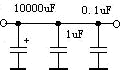 当电源滤波电路直接供给放大器工作时,其容量越大音质越好。但大容量的电容将使阻抗从 10KHz 附近开始上升。这时应采取几个稍小电容并联成大电容同时也应并联几个薄膜电容作为高频补偿,在大电容旁以抑制高频阻抗的上升,滤波电路电容的并联如下图所示: