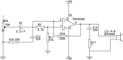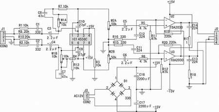 上图电路前级中J1是双声道输入端,R8和R10是输入电阻20k,R1和R2、C1和C2用于改善音调,R7、W1、C8、IC1组合成反馈式音调调节电路,C10作超音频滤波使用,有时可不安装使用,W1取5k~10k用作音调调节,电路IC1作前置放大,③脚为正相输入,②脚为负相输入,①脚为输出,采用双12V~15V电源,可在输入端增加R*改善空载噪音,可取值500~5k等。