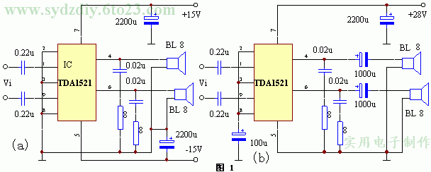 用高保真功放IC TDA1521A制作功放电路,具有外围元件少,不用调试,一装就响的特点。适合自制,用于随身听功率接续,或用于改造低档电脑有源音箱。