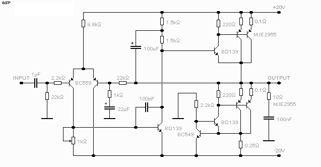| 电路原理和设计思路,整机电路可以分为四部分: 输入级:核心电路是由两只BC559组成的差分放大电路,22K对地电阻为三极管的偏置电阻,它的大小同时决定了整个功放的输入电阻。8.2K电阻是差分对管的公共发射极电阻,决定了差分电路的共模抑制比和本级的静态工作电流。经过输入级放大的电流在流经1K可调电阻时产生的电压信号,直接输送到下一级。 1UF电容是整机的输入电容,其容量的大小和制造材料对音质的影响很大。根据理论计算,1UF的电容与输入电阻22K组成了一个高通滤波电路,它的低端转折频率可以用下式计算:f=1000/(2*3.14*22*1)=7.2HZ。(在过去将放大器的低端频响定位在20HZ时,还是可接受以的。现在数码音源大行其道的今天,看来还是高了一些,低端转折频率定在1HZ以下还是可以接受的。)由于该电容的重要性,一定要选择品质优良的进口音频专用耦合电容,在国产的电容中,新德克的品牌还是值得信任的,经过笔者和朋友的试用,效果令人满意,只是体积稍大了些,在设计电路板时要考虑是否能安装得下。 8.2K电阻决定了输入级的晶体管静态工作电流,可以由下式进行估算(两管值):VCC/8.2K=20/8.2=2.4MA。由于输入级的晶体管静态工作电流对音质有较大的影响,可以调整该电阻的大小来满足自己的要求。(晶体管静态工作电流小,信噪比高,但是音质发干,低音单薄。如果电流大一些,音质温暖,低音厚实,但是晶体管特有的高频噪声和反映在音频内的电流声也会增加,使信噪比下降。本机取2.4MA还是比较合适的。) 电压放大级: 为了简化电路,本机使用一只三极管BD139,采用共射放大电路,还采用了自举电路。 本级的静态电流可以由下式进行估算:VCC/(1.5k+1.5k)=6.8MA。100P的小电容是做频率补偿用的,容量要尽可能的小,如果没有高频自激,可以不用。(当然由于这个小电容的存在对音质有微妙的调节作用,具体怎样处理,看自己的喜好了。) 为了保证大信号输出时的幅度特性和线性,同时又不增加太多的元件,本机采用了自举电路,由100UF电容和两个1.5K电阻的分压电路组成。在音响界对于自举电路的批评较多,认为它是一种正反馈,对音质的负面影响较大。由于本电路的出道年代较早,设计前提是“简洁至上”,也许在这里考虑的不是那么全面。 输出级:在原理图的上部的两只MJE2955和周边的元件组成了单端纯甲类放大电路,下半部分以两只MJE2955为核心组成了大电流恒流源电路。其恒流电流值就是输出级的静态电流。可以根据下式估算:0.65/0.25=2.6A。(其中的0.65V是硅三极管的发射结的PN结正向导通压降)通过改变0.25电阻阻值的大小可以调整输出级的功放管静态工作电流。本电路中,要求在8欧负载上有20W的纯甲类输出,2.6A这个电流显得有点大了,实际上有公式可以估算:P=2*I*I*RL,这样一来有大约为 1.1A就可以满足设计要求,但是我们的扬声器的阻抗并不是象纯电阻一样保持不变的,有时候在特定的频率和极端的情况下,阻抗可能会降得很低。按照电路的设计如果使用4欧的负载,输出40W的纯甲类也是完全能达到!仅仅这种设计的科学态度和严谨的思路是值得我们学习的。 扬声器阻抗补偿电路: 因为我们采用的扬声器是感性负载,为了使放大器的负载接近纯电阻,在功放的输出端对地一般都有电阻和电容串联的补偿电路,其电阻的阻值和扬声器的标称阻抗相当,电容的取值为0.1UF-0.22UF,这里不再详述。 安装调试注意事项: 电源部分:由于纯甲类单端功放的共模抑制能力很差,又加之本机的静态电流很大,因此对电源的要求很高,最好采用电感滤波电路,但是对于电感的制作和应用后产生的电磁干扰的处理都很让人头痛,采用稳压电路也是很好的选择,只是成本和散热问题也来了,还是忍痛舍弃吧。最终不得已选择了电容滤波电路,变压器的容量要在 1000W以上,次级电压为四线并绕的四组15-18V,电流容量在10A以上,两两串联成两组双电压,分别供给左右声道,整流全桥要选择电流25A以上的,耐压不必太高有200V就足够了。滤波电容的容量每声道正负电源每边不得小于2.2万UF,当然是越大越好了,不过要注意最好用多个小容量的电容并联起来,达到所要求的容量,至于要并联小容量的高频特性好的无极性电容更是必须的。虽然成本增加了,但是效果可是好多了,好在25V的电解电容的价格较低。因为“在好的功放里,电源的成本要占一半!”笔者十分欣赏这个观点。如果采用双单声道设计,从变压器--整流滤波电路--放大电路--输出,各自都是独立的就更好了。 制作、调试:正是由于电路简洁,所以音质几乎就是由原器件的特性所决定的。图中标示的晶体管,现在看来已经不太发烧了,读者可以根据现在的流行趋势进行代换。由于电路的发热量较高,要求元件的可靠性一定要高,电阻一律选用1/2W的金属膜电阻,所用电容由于用量较少,一定要选用精品。只要原器件的质量和焊接技术能够保证,整机的调试十分简单,通电前先把1K的可调电阻置于中间位置,在通电以后,调整该电阻使输出端对地电位尽量接近0V 即可,其余都由电路和原器件保证。保持空载半小时以上,观察散热器的温度不太高,其他元件无异常,复测输出端电位不是太大,就可以投入使用了。由于功放的元件还需要老化,可能你要听到靓声,还需要一段很长时间的煲机过程。 本文中没有涉及保护电路,为了保护您昂贵的扬声器系统,强烈建议加装安全可靠的喇叭