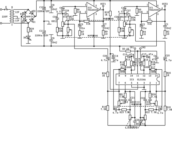 本立体声功率放大器是以集成电路TDA2030A为主组成的立体声功率放大器,其采用典型的功率放大电路,具有失真小、外围元件少、稳定性高、频响范围宽、保真度高、功率大等优点,同时采用四运放GL324A对输入音频信号进行处理及高、低音进行控制,从而更加保证输出声音的音质。这是一款很适合无线电爱好者和音响发烧友自制的音响套材。本功率放大器实际聆听,高音柔美细腻,低音丰满圆润。一、工作原理 本立体声功率放大器所用的核心芯片是国际通用高保真音频功率放大集成电路TDA2030A。本电路由三 个部分组成,即电源电路、左右声道的功率放大器及输入信号处理电源(四运放)。电源变压器将220V交流电降为双12V低压交流电,经桥式整流后变为±18V的直流电,作为功放及运放的供电电源,D5、R29组成电源指示电路,以指示电源是否正常,开关K为电源开关。 四运算放大器GL324A(或LM324)及外围元件组成高、低音控制电路及音频输入信号的处理电路,C16、C18分别是两路信号的输入耦合电路,W1是两路低音控制电位器,W2是两路高音控制电位器,C25、C26是输出耦合电容。GL324A的4脚与11脚分别是正、负电源的接线端,3、5脚是接地端。 两路功率放大器用的集成电路是TDA2030A,其1脚为正相输入端,2脚为反相输入端,C3、C6分别为左、右两路的输入端耦合电容,R1、R4、C2构成IC1的负反馈电路,R6、R7、C5构成IC2的负反馈电路,以提升音质。其5脚、3脚分别接正、负电源,4脚为输出端,负载接4Ω的扬声器时,其有效功率可达20W,W3是两路平衡电位器,W4是两路音量电位器。二、焊接与安装 一般先装低矮、耐热的元件,最后装集成电路。应按如下步骤进行焊接与安装:(1)清查元器件的数量及质量,并及时更换不合格的元件;(2)由孔距确定元件的安装方式,电阻器采用卧式安装,涤沦电容器、电解电容器采用立式安装,并都要求紧贴电路板。(3)插装IC1、IC2务必小心,脚全部插进后再焊接,并注意与散热器的孔位吻合。各焊点加热时间及用锡量要适当,防止虚焊、假焊及短路,焊后剪去多余引脚,并检查所有焊点,确认无误后方可通电测试。同时还要注意电源变压器初、次级与开关及电路板的接线,不得有误,IC1、IC2用自攻螺丝与散热器相连。三、测试与组装 1、通电测试 全部元器件及插件焊接完后,经过认真仔细检查后方可通电测试,用万用表直流电压档测量正、负电源应是±18V左右,发光二极管D5发光,接上音柱后,手触碰输入端IN1、IN2,应有较强的感应信号,说明电路正常。如没有较强的感应信号,说明功放电路没有工作,需进一步检查IC1、IC2、IC3及周边元器件安装焊接是否正常。2、整机组装
