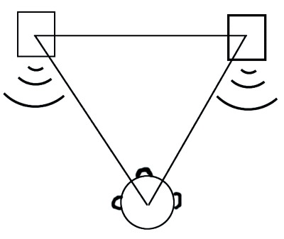 前置左右主声道音箱按等腰三角形的摆放方式(图1),底边长1.5m~2.0m。如果两个前置音箱彼此距离过近,人耳听到的只是扬声器直接的声场效果,没有听到经过墙壁及周围空间的反射的渲染效果,声音不免干涩、混杂。即便是经过了墙壁的反射,由于你离声场过近,经过衍射的声音也被掩盖了,你是很难听到的。一般来说,两个主音箱最好与听者呈45°夹角,如果音箱距离听者太近的话,音域定位不精确,且高低音单元存在相位差,声音不同步;距离太远,音场会变窄,失去空间感和临场感。