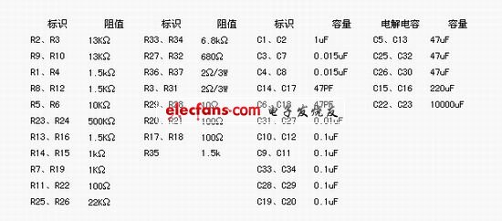 元件表见下表,因为左右声道所对应的阻容元件值相同,所以电路图以右声道为样板来讲解,看这个表就可看出相对应的元件标识。
