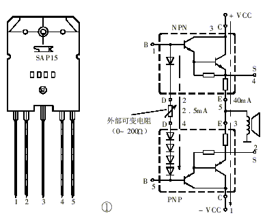 甲类晶体管功率放大器,音色温暖甜美,使人倾心。但甲类功放温升较高,如采用普通的双极性晶体管,则温度稳定性较差,调试困难,使用中也让人担心。本文介绍输出级采用三肯产品SAP15N/P音响对管的甲类功放。SAP15N/P输出电流15A,耐压160V,功率150W,结温150℃。该晶体管内置温度补偿二极管阵列,解决了功放电路中温度补偿延迟的技术难题,它的温度补偿二极管置于晶体管芯片的中心部位,能够快速同步地检测晶体管温度的变化,并对偏置电流进行修正,使之保持恒定。普通双极性晶体管制作的甲类功率放大器,因温度变化,放大器进入稳定的时间较长,往往通电半个小时后才能够稳定下来,而且随着气温的不同,偏置电流也会随着变化。实际使用中,也要煲机半个小时后才能听到真正甲类的音色。而采用SAP15N/P对管,由于它内部温升和补偿的一致,放大器通电几分钟后,就进入稳定状态,其效率高,工作稳定、安全。因此,可以说SAP15N/P对管是甲类功率放大器的最佳拍档。除此之外,SAP15N/P还具有工作线性好、饱和压降小、电源利用率高等诸多优点。SAP15N/P除温度补偿二极管外,内部还自带末前级推动晶体管和射极0.22Ω电阻,具有很高的性价比。图1是SAP15N/P的外形图及内部电气原理图。它有5根引脚。在它的NPN侧内部有一个PN结二极管,PNP侧内部有五个肖特基二极管起温度补偿作用。使用时,在NPN管的二极管和PNP管的肖特基二极管之间加一个可变电阻,以调节空载电流。