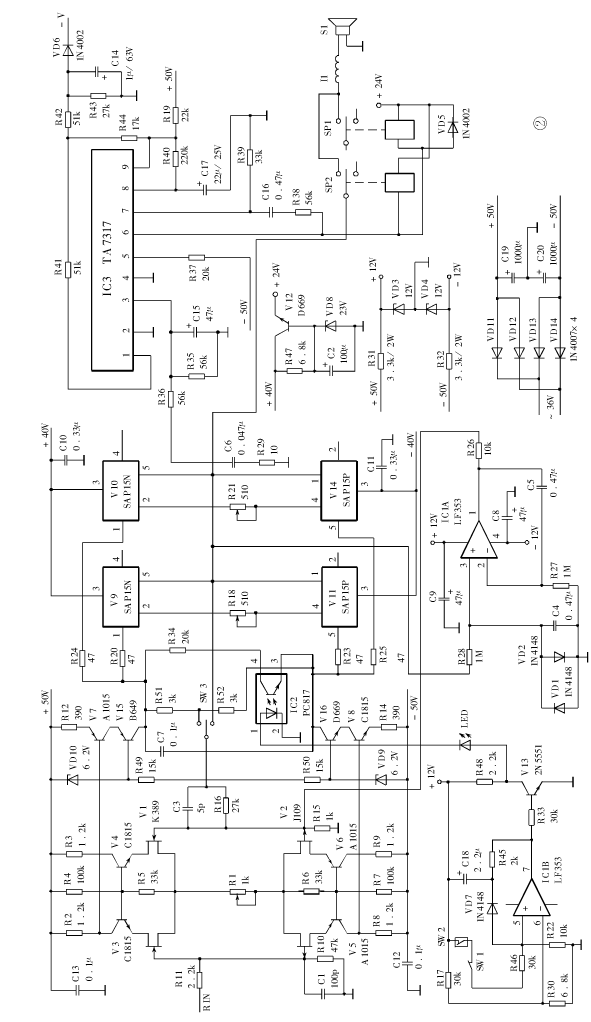 图2示出了采用甲类单声道设计的功放电路。该功放具有温度检测和保护功能,还具有直流中点伺服等特点。其输入级采用了由场效应孪生管V1/V2(K389/J109)和晶体管V3~V6构成的共源-共基电路,该电路高频失真小,动态范围大,信噪比高。在第二级电压放大级中,V15、V16构成双级推挽级联电路,V15/V7和V16/V8分别构成理想的电流源,电流放大分别由V7、V8完成,电压放大由V15/V16完成。扬声器保护电路采用东芝扬声器保护集成电路TA7317(IC3),其中VD6是关机静噪电源检测,接变压器交流端。V12和VD8构成继电器工作电源。场效应集成双运放IC1(LF353)中的IC1A进行直流中点伺服以稳定中点电位;IC1B与V13、温度检测开关SW2以及光电耦合器IC2组成温度检测和保护动作电路。温度开关触点为常闭触点,动作温度90℃,使用时用螺丝固定在散热器上检测温度。正常情况下,温度开关SW3的触点闭合,IC1B的⑤脚电压高于⑥脚,⑦脚输出高电平,V13导通,其集电极呈低电平,光电耦合器IC2无电流通过;当散热器温度到达90℃时,SW3断开,IC1B的⑤脚电压低于⑥脚电压,⑦脚输出低电平,V13截止,其集电极呈高电平,电流流经IC2的①、②端,致使③、④端导通,这时电阻R51对激励信号进行分流,从而减小末级的静态电流,工作状态由甲类改为甲乙类,进而降低晶体管的工作温度,确保其安全。IC1和VD7还组成自保持电路,当温度保护电路动作以后就将IC1B的⑤脚的比较电压钳制在低电平,使功放保持甲乙类工作状态。温度保护动作以后,关机后再开机自动恢复甲类工作状态。SW1是甲类或甲乙类工作方式手动选择开关,可以人为事先设定,SW1闭合是甲类放大,SW1断开是甲乙类放大。发光二极管LED亮时,指示功放工作于甲乙类状态。甲类功率放大器温度较高,有了温度检测和保护,就不会有“天有不测风云”之忧。另外,开关SW3可对末级是否采用大环路负反馈进行选择。功放激励级电源由线路板上的±50V电源提供。为节省体积,便于线路板(250×80mm)贴近散热器一起竖直安装,末级的整流滤波器件不在功放板上,图2中就省去了末级电源的电原理图。