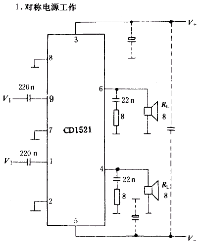 CD1521采用9引线塑料单列直插封装。结构框图(代换型号)见:TDA1521。
