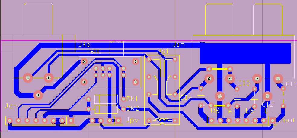 输入电路原理见图13,PCB见图14。图中Jin是2*2的RCA信号输入插座,前级分频后的左右声道的高低频信号由此输入,Jout是连接功放板的接插排,分别向左右声道功放板输出高低频信号;Jfo用于直接输出左右声道的低频信号,为外接低音箱而准备。Jcn是工作模式选择输出接口,其中1-4脚用于连接图8中的继电器控制接口JP1或者JP2,每块功放板上连接一个;5-7脚用于控制面板上的工作模式指示灯,当SW连接到不同档位时点亮相应的LED。Jvp是12V控制电源接口。