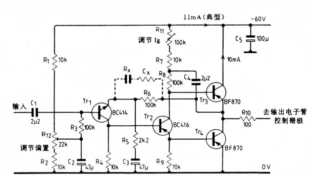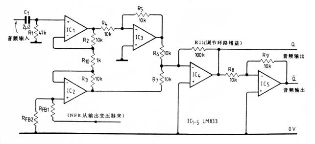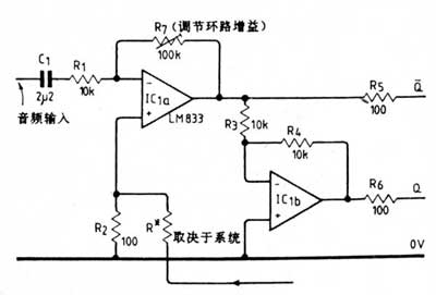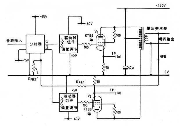 混合型放大器的基本结构示于图1,图2为驱动器电路,该电路是本人1969年发表在Wireless World(无线电世界)上的四管甲类放大器电路。因为除输入端的隔直流电容外,驱动器电路是直接耦合的,所以调节Trl的输入直流电平将影响到直流输出电平,从而对输出电子管的栅极偏压加以控制。当然,若用推挽方式驱动两个输出电子管并以输出变压器次级实现整体环路负反馈,就需要某种输入分相器。这里以失真很小的宽带运算放大器LM833为基础设计了一个分相器电路,如图3所示。
