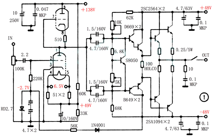 电流放大级采用三级射极跟随器,设置足够的电流增益,减轻了前级胆管的负担。用两对D669/B649组成达林顿管结构,能消除由于信号过载引起的饱和削顶现象。当前级管接近饱和时,电流增益会迅速降低,使末级管水远不会进入饱和区,实现信号“软着陆”,避免刺耳失真。彻底取消负反馈,各级均采用推挽电路。