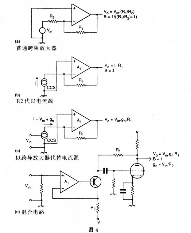 图4总括说明了整个设计思路,图4a为普通工作的虚拟电路的跨阻抗放大器,图4b为用恒定电流源替代电阻R2的电路,其反相输入端上有100%的负反馈,电压增益为零。图4c为以跨导放大器来替代恒流源的电路,由于反馈系数p近似为1而使失真很小。图4d将图4C转换为有电子管的混合电路。