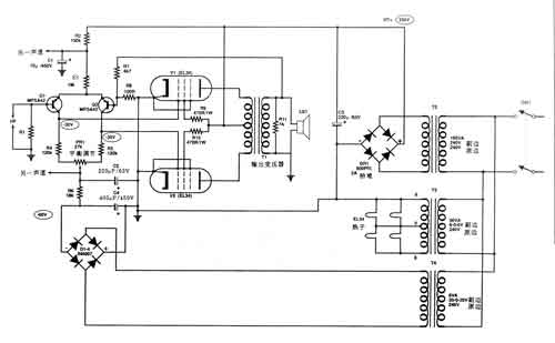 1、电源,这包括电子管放大阳极供电的高压HT、加热傍热式电子管EL34“热子”(俗称灯丝)的6.3V电压及由变压器T/t经整流获得的-60V直流电压与高压HT组成共同提供晶体管Q1、Q2工作的电源。