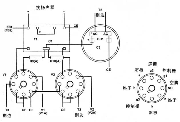 2、由电子管V1、V2及周围元件与输出变压器组成的推挽式功率放大级。