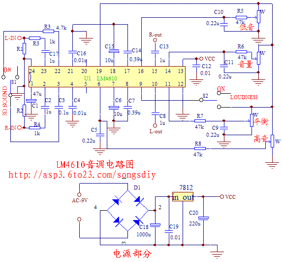 LM4610是美国NS公司继LM1036后推出的一款新型的高档HIFI级的音调集成电路,是LM1036的理想替代产品,它也是利用直流电压来调节两个声道音量,高音,低音,平衡。该IC还在LM1036的基础上增加3D声场展宽调节,它还带有一个等响度开关,用以补偿在小音量时的人耳特性曲线。
