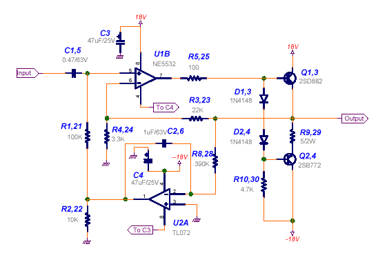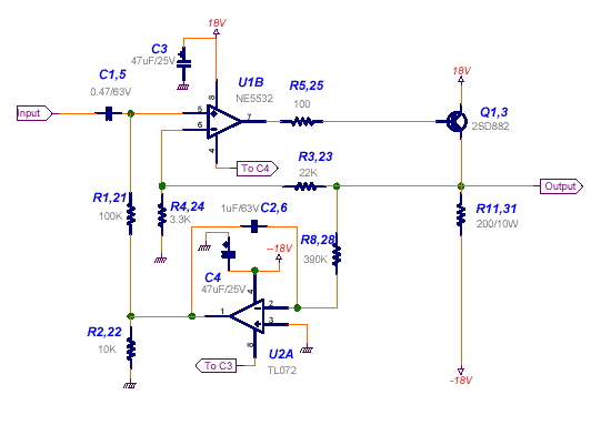 上图为电路图,电路很简洁,前级放大推动为NE5532或其它类型的OP,U2A为DC SERVER,用于稳定中点的电位,推动级2SD882为NPN型功率三极管,该管工作在甲类状态,因此发热量较大,流经的R11,R31的电流可以通过改变它的阻值来调整,在制作时三极管要加散热器。