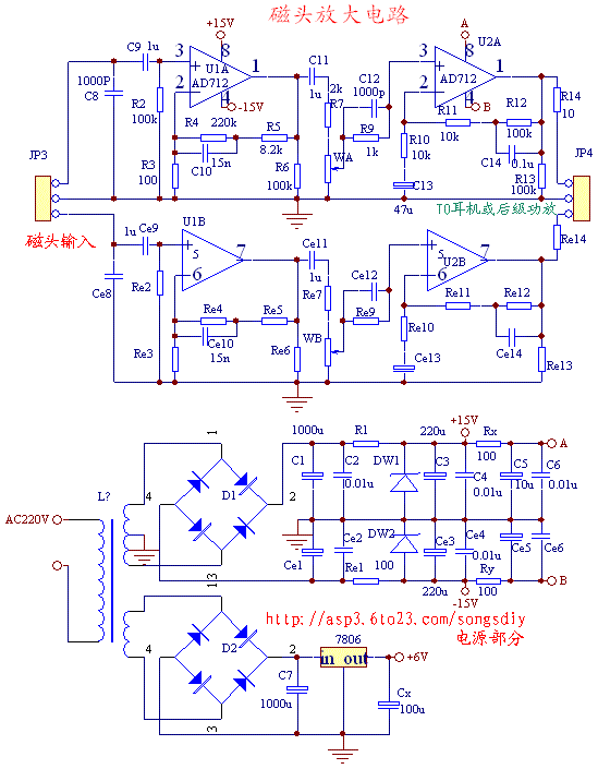 以下是笔者做的一款用AD712制作的磁头前级放大电路: