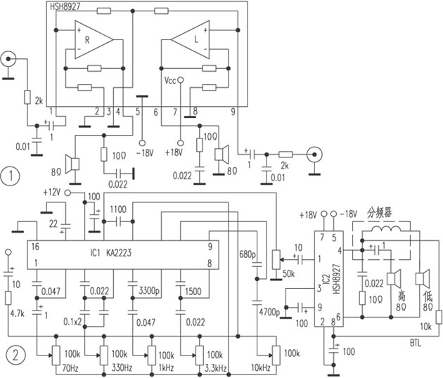 该IC是单列9脚封装,其主要电参数:工作电压典型为±16V,极限为±20V,输出功率在VCC=±18V时,在4Ω负载上每声道为30W,BTL接法可达80W;总失真度为0.15%;立体声道分离度为65dB;静态电流为70mA;闭环电压增益31dB。引脚功能:①R声道同相输入端;②R反相输入端;③内部中点电位;④R声道输出;⑤电源负极;⑥L声道输出;⑦电源正极;⑧L反相输入端;⑨L同相输入端。图1是HSH8927双声道简易功放电路,采用双电源供电,适合驳接台式收录机,若接VCD音频信号,必须加设前置驱动放大电路。如果需要更大的输出功率,可选用图2的BTL电路,输出功率可达80W。IC1是一个集成化5频点均衡器,调节各电位器可在70Hz、330Hz、1kHz、3.3kHz、10kHz的频段进行音频的提升或衰减。