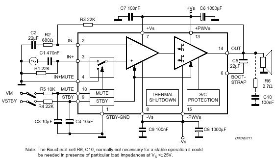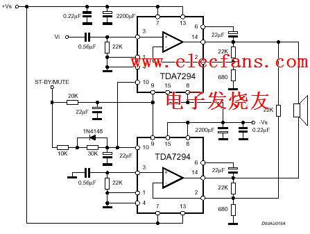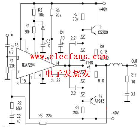 tda7294功放电路图:电路如图1所示,推动级采用了意法(SGS-THOMSON)公司的新品TDA7294,该芯片内部推动级和输出级均使用了DMOS场效应管,用±40V供电,输出功率可达70W(RMS/8Ω)、低失真(0.005%),音色细腻、听感极佳,乃近年来屈指可数的优秀芯片。功率输出VT1、VT2采用山肯大功率对管2SA1394、2SC3858(VCM=200V,ICM=15A,PCM≥200W,fT=30MHz)。电路原理如下:信号经C1、R1输入IC正相输入端③脚。R7和IC第②脚的R3、C3、C4构成负反馈网络,本放大器的闭环增益约34倍。⑨、⑩脚分别是待机、静音端,由于第⑩脚R、C网络时间常数比第⑨脚大,使得开关机均在静音下进行,避免了开关冲击声,C7为自举电容。