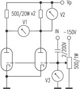 原理如下图所示,利用电桥平衡原理,无需输出变压器和倒相电路,具体要求有:1.两只500Ω电阻相互阻值之差应≤0.1Ω(可用军级线绕电阻);2.灯丝电压必须是被测管的额定电压;3.屏压应和制作电路的屏压一致,栅压在-100~0V连续可调,无需稳压。工作原理为:两管屏流之差ΔIP和电压表V1读数成正比,即ΔIP=V1/500。V2用以测量屏流(管耗),V3测量栅压(均可用表V1来测量)。静、动态配对举例说明:1.插上管子预热两分钟后,加上屏压,观察V1读数,若V1≤1V,此时ΔIP≤2mA,可认为是配对管。若V1≤50mV,此时所测的两管已是千里挑一的对管。屏流在管耗允许内可选择若干个点(连续调节栅压)进一步配试;2.调好栅压,在IN端输入音频信号(音频信号发生器可仿《电子报》1997年合订本《扬声器参数业余测试》制作),观察V1读数,同时也可用台双踪示波器挂于阳极观察波形(这样可找出胆管最佳交流工作点),动态配对性好,有利于减小基波及非线性失真。V1的读数200Hz以下应≤1V,200~500Hz应≤500mV,500Hz~5kHz应≤250mV。若为四、五极管,应加上帘栅压进行测试;若为直热式管,电压表V1宜选用指针表。