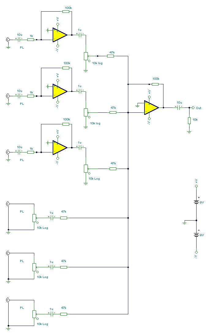The mixer circuit below has 3 line inputs and 3 mic inputs. The mic inputs are suitable for low impedance 200-1000R dynamic microphones. An ECM or condenser mic can also be used, but must have bias applied via a series resistor. As with any mixer circuit, a slight loss is always introduced. The final summing amplifier has a gain of 2 or 6dB to overcome this. The Input line level should be around 200mV RMS. The mic inputs are amplified about 100 times or by 40dB, the total gain with the mixer is 46dB. The mic input is designed for microphones with outputs of about 2mV RMS at 1 meter. Most microphones meet this standard.