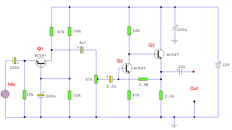 This is a 3 stage discrete amplifier with gain control. Alternative transistors such as BC109C, BC548, BC549, BC549C may be used with little change in performance. The first stage built around Q1 operates in common base configuration. This is unusuable in audio stages, but in this case, it allows Q1 to operate at low noise levels and improves overall signal to noise ratio. Q2 and Q3 form a direct coupled amplifier, similar to my earlier mic preamp.
