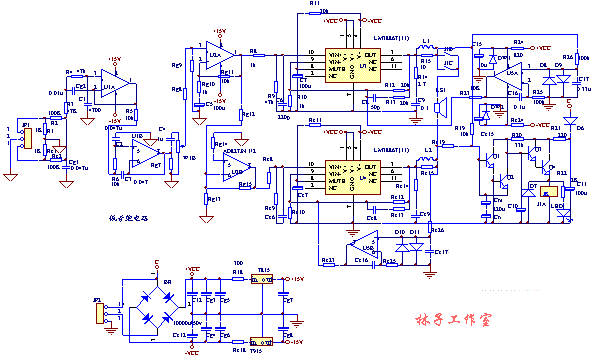 低音炮的电路部分见图1。有源低音放大器的电路原理大同小异,基本是由低通滤波器和功率放大器构成,本电路也不例外,由大家均已熟知的NE5532组成120Hz 低通滤波器,对输入的120Hz以上的信号滤除,再送入大名鼎鼎的LM3886功放集成电路进行功率放大,将浓郁强劲的重低音信号送到扬声器中。大功率集成电路LM3886的音色非常好,个头虽然不大,但其效果比一般分立式晶体管放大器有过之而无不及。