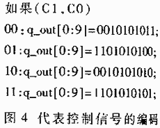 T.M.D.S.的每一条通道都由连续输出的10bit串行编码驱动。在显示的消隐?5??DE=0?时间段内编码器输出四个特定编码,详见图4,也就是前面所说的可被解码器唯一确定识别的四个编码。在DE=1时编码过程分为两个阶段,第一阶段对8bit的象素数据进行最小变换生成9bit的最小变化码,其中最低有效位与象素数据的最低有效位相同,第9位为变换方式标志位:0表示对象素数据进行异或非?XNOR?变换,1表示进行异或?XOR?变换;第二阶段生成10bit的直流平衡码:如果上一次编码传输了过多的1且将要传输编码中1比0多,则将此次编码的低8位取反并在第10位置1,否则,将不作处理,直接传输。