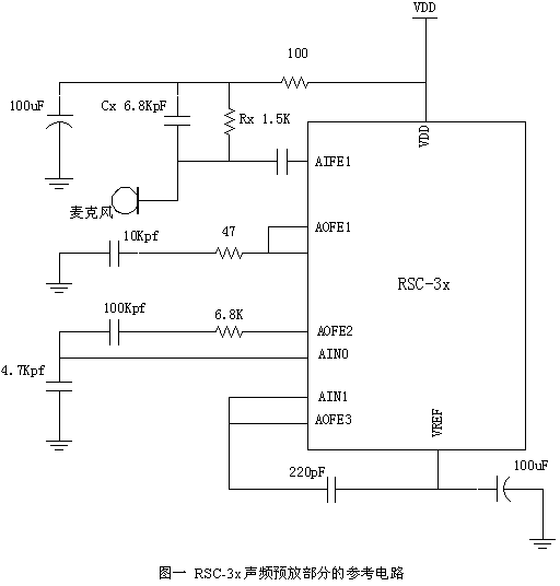 图一是RSC-3x声频预放部分的参考电路。阻值为1.5K的麦克风电阻(Rx)对系统增益具有很大的影响,因此应根据麦克风的敏感度来决定其值的大小。图中的1.5K是典型值。