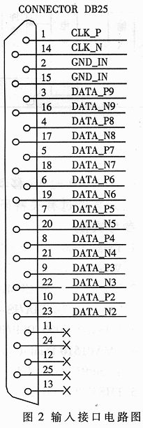 由于输入的标清视频信号其频率高达27MHz,考虑到必须要保证视频信号的质量,减少信号在传输过程中受到的干扰;需要采用差分信号传输(实际中采用了LVDS信号),输入电路板后再转换为普通TTL数字信号。根据标准[3],差分信号的物理接口需要采用DB25的形式。