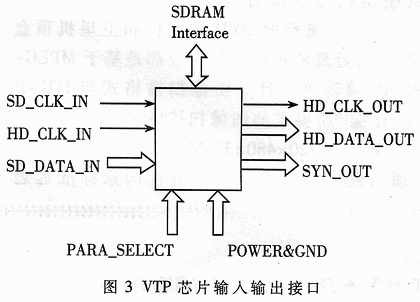 视频格式转换模块是本电路系统的核心部分,包括VTP芯片和SDRAM两部分。其中VTP芯片是一颗专用视频处理芯片(ASIC),有如下主要功能: