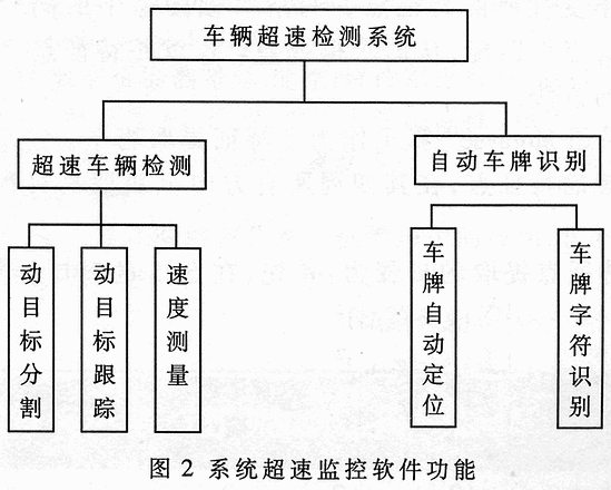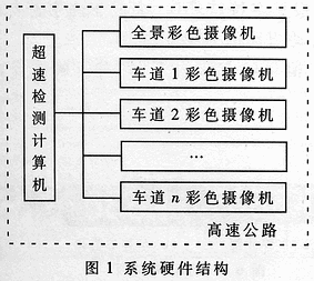 高速公路视频超速监控系统的硬件结构如图1所示。它由超速监控摄像头和现场计算机等部分组成。在高速公路上安装监控摄像头(一个彩色全景摄像机、n个车道级彩色摄像机)及超速监控计算机,24小时实时监控高速公路上所有通过车辆的车速信息。系统软件包含超速车辆检测和自动车牌识别两部门。超速监控计算机通过实时视频采集卡首先采集高速公路的全景图像,并利用全景图像进行超速车辆检测;如检测到违章车辆,启动相应车道的摄像机工作,采集近景图像并用利近景图像自动车牌识别,其识别结果可分车牌号码字符、车牌号码照片、汽车违章照片分别修配存到超速违章车辆数据库,以供事后处理;如需要,还可通过无线、有线或光纤通信网自动向高速公路收费站的违章处理服务器传送违章车辆的车牌号码、违章照片信息,以实时进行违章处理。软件系统功能框图如图2所示。