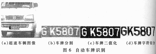 针对分割完成后的牌照图像进行字符自动识别,需首先对车牌图像二值化、字符切分和规范化、字符特征提取,然后根据字符特征库,完成车牌字符自动识别。图6为字符自动识别的效果示意图。