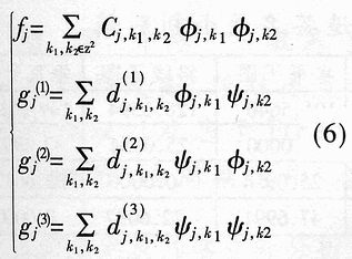 对于二维的情况,设{V2J}jez是一个可分离的MRA:V2J=VjVj,其中{V2j}jez是L2(R2)的一个MRA,其尺度函数为¢是一维MRA{V2j}jez的实值尺度函数,小波母函数采用Dabuechies[6]小波;相应于二维尺度函数V2j=VjVj,定义三个函数: