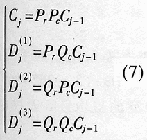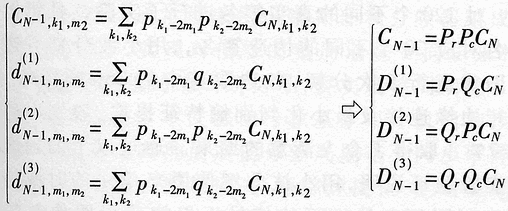 上式中箭头右部分是左部分的矩阵表示,其中CN是原始信号f(x,y)的分布阵列,Pr、Pc是分别对CN的行与列作低通滤波的算子,而Qr、Qc是分别对CN的行与列作高通滤波的算子。而进一步地第j次分解应为:
