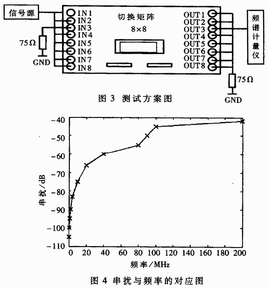 其中,s=jw是拉普拉斯转换量,Atest(s)是选定的信道中的串扰信号的振幅,而Atest(s)是测试信号的振幅。如以dB值表示信道间串扰值,则可以看到︱XT︱是一个与频率相关的量,而与测试信号的幅度无关。另外串扰信号与测试信号之间还有着相位相关的关系。根据串扰的有关定义,可以建立一个测试环境来测量串扰与频率的关系。如图3所示,让IN3通过一个75Ω的电阻接地,另外的7路线路输入1V标准电压的测试信号Atest(s),且测试信号的频率可以调节,而这7路的输出端也是通过75Ω的电阻接地。然后测量OUT3输出链路信号的振幅Asel(s)。根据公式(1)可计算出通道间串扰的水平。改变输入测试信号的频率继续进行串扰的测试,就可以得到一个与频率相关的串扰变化图,如图4所示,一般来说,由于高频信号的干扰特性表现明显,串扰会随着频率的变高而逐渐加大。在这里测量了7路输入对单路信号的串扰,当要测量一个信道对另外一个信道的串扰时,也可以通过这个测试方法来实现。