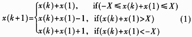即x(k+1)仍然是(-X,X)之间的随机数。在下一次运算时,将x(k+1)移到x(k)的位置,xk)移到x(k-1),……,x(2)移到x{1},然后再做模X运算,相加得到x(k+2),如此循环,产生序列{xn}。
