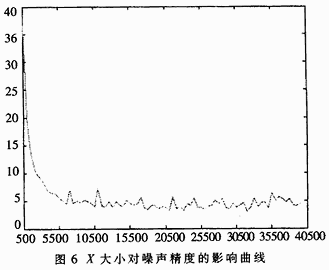 考虑高斯分布的实际情况,并经过试验验证y仅在[-4,4]之间取值,就能够达到令人满意的精度。图6给出了X大小对噪声精度的影响曲线,纵轴为平均误差。