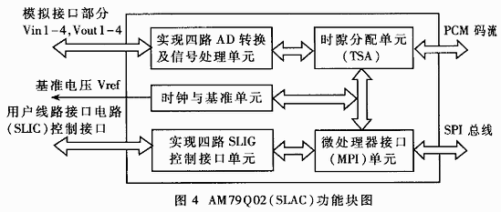 选用AMD公司SLIC用户线路接口芯片AM79R79(简称SLIC)实现电话的接续各状态的转换,监视电话线的负载变化,实现摘机检测、馈电供给及振铃传送;与其实现无缝接口的SLAC用户音频处理芯片AM79Q02(简称SLIC)实现电话的连续各状态的转换,监视电话线的负载变化,实现摘机检测、馈电供给及振铃传送;与其实现无缝接口的SLAC用户音频处理芯片AM79Q02(简称SLAC)实现语音的A/D转换,并成帧到PCM码流中。SLAC)实现话音的A/D转换,并成帧到PCM码流中。SLAC提供的SPI MCU总线接口简化了与MCU的硬线连接,并且SLAC(提供完全的SLIC的控制总线)与SLIC可实现无缝连接,因此对SLIC的控制可完全简化为直接控制SLAC来间接完成,简化了硬件电路的设计,节省了用户的开发成本。