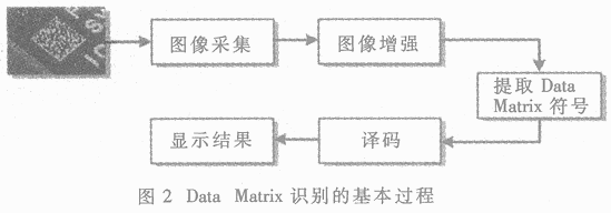 Data Matrix识别的基本过程如图2所示。通过MIL提供的函数采集图像,并将采集的图像以数字化方式存储在图像缓冲区中;对图像进行增强处理,提高图像的识别准确率。实验中通过平滑滤波方法,减少图像噪声,很好地解决了采集金属零件的Data Matrrix码时,由于码符号边沿亮度过亮影响图像分割问题;然后对图像进行直方图均衡化,扩大对比度的动态范围,解决由于光照或摄像头的原因,造成采集的图像偏暗,对比度不够显著,引起图像中明暗模糊不清的问题。