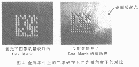一种比较好的方法是用侧光的方法。由于金属零件上的Data Matrix码是气动打印产生的,打印处会有高低起伏,这些区域的反光是温反射,不同于其他区域的镜面反射光,侧光助于把点阵与金属反光的背景分开,将摄像头避开了金属的镜面反光。图4对比了侧光和反射光下的二维码状态。