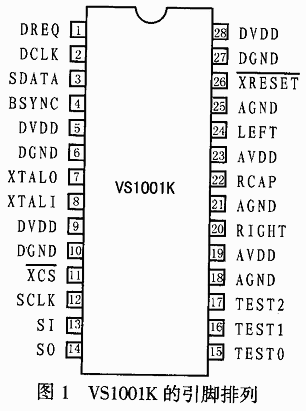VS1001K具有两种封装形式:分别为28脚SOIC双列式和49脚BGA球栅阵列式。图1给出了28脚SOIC封装的引脚排列图。各引脚的具体功能说明如表1所列。