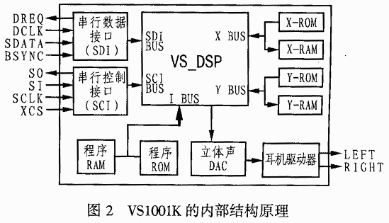 VS1001K解码芯片内部集成有VS DSP处理器,同时它还集成有立体声音频DAC、立体声耳机放大驱动器、以及程序ROM和程序RAM等,此外,VS1001K还带有串行的数据接口和控制接口。图2是VS1001K的内部结构原理框图。